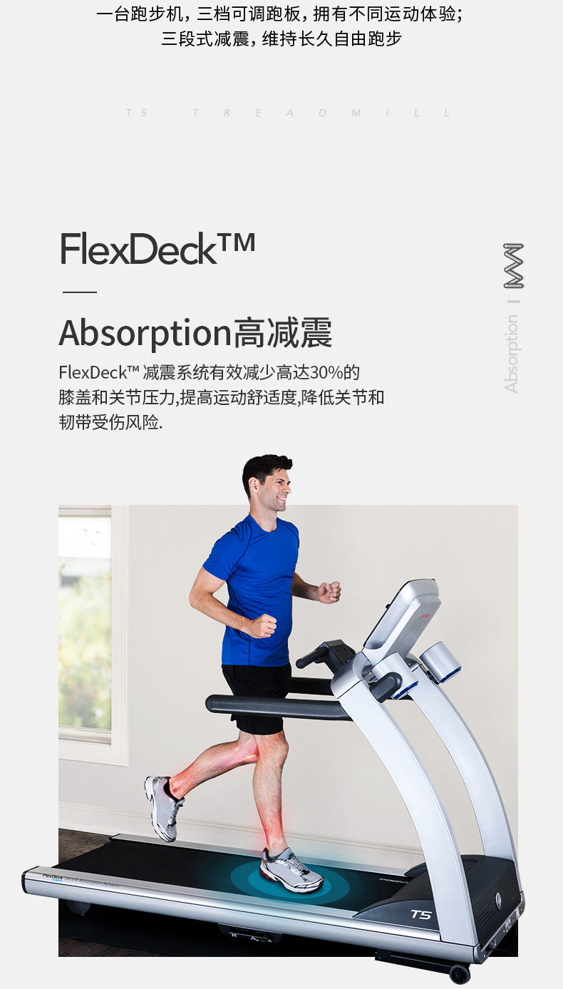 利用 T5 跑步機(jī),您可以在三個(gè)不同的跑合面硬度設(shè)置下訓(xùn)練,這歸功于 FlexDeck Select 系統(tǒng)。直觀的跑步機(jī)界面讓您可以記錄首選的步數(shù)、慢跑和跑步速度,還讓您可以選擇很多其他程序 - 都通過觸摸一個(gè)按鈕完成。
